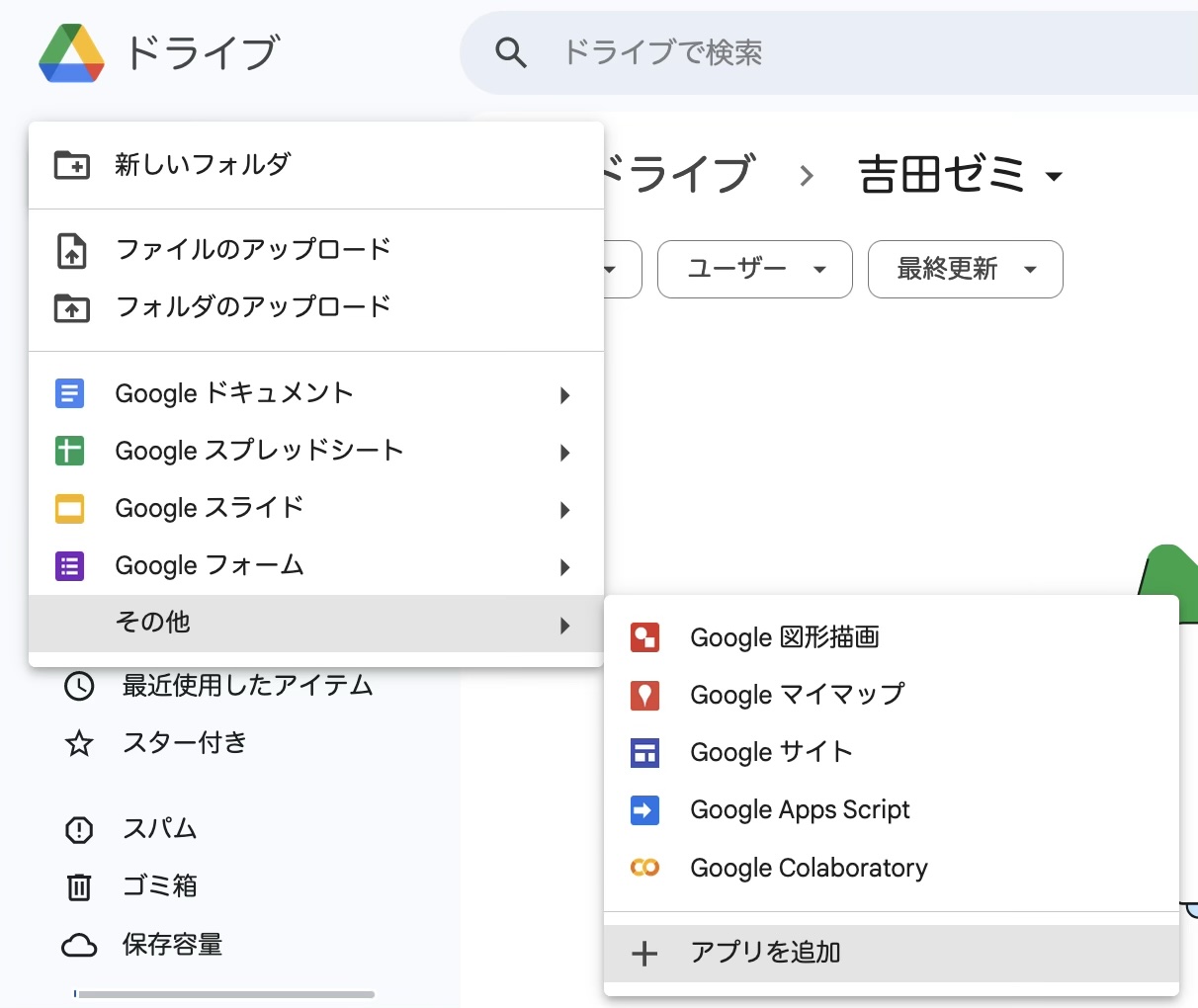 1. Google Drive の「吉田ゼミ」フォルダに新しい Colab ノートブックを作成する